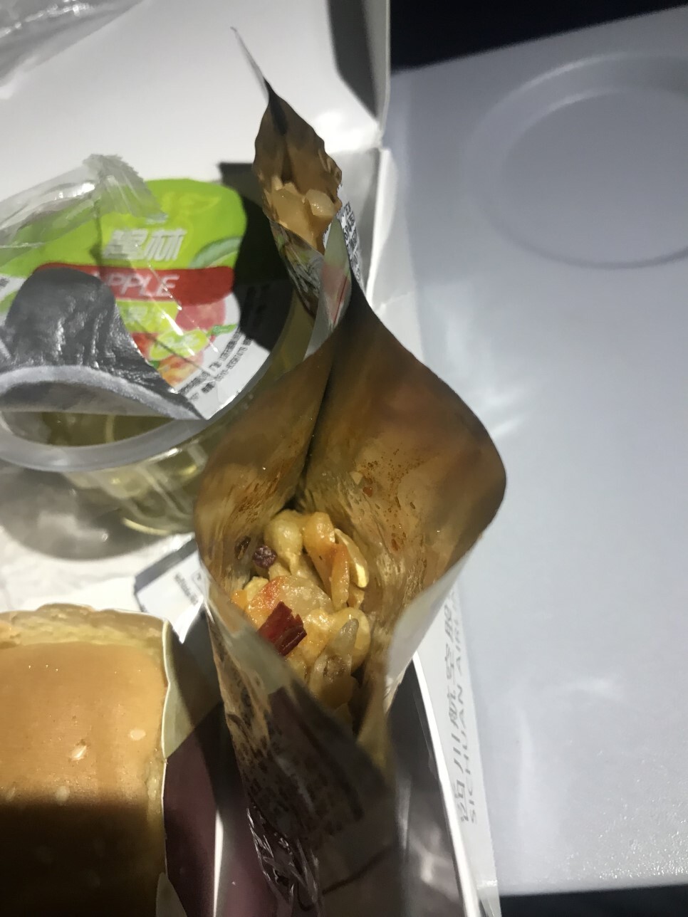 그리고 옆에 조용히 자리잡고 있던 견과류와 뜬금 짜사이(?). 견과류는 사천스타일 반영했는지 맵고 얼얼한 맛이 특징인데 맥주와 잘 어울리겠다는 생각이 들었다. 다만, 사천항공은 기내식 음료로 맥주는 제공되지 않았기에 잘 어울리는지는 확인할 수 없었다. 그리고 짜사이는 대체 왜.. 빵 사이에 넣어먹으라는 것인가? 빵을 두개나 줬으면 잼과 버터를 주든지, 아니면 짜사이와 잘 어울리는 요리를 주는게 낫지 않았을까? 이게 대체 무슨 조화란 말인가.